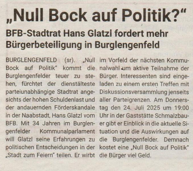 Burglengenfeld weist nach Einschätzung des BFB-Vorsitzenden unter Einschluß der Tochtergesellschaften ein Defizit von umgerechnet 5.000 Euro pro Einwohner auf „vermutlich die höchste Pro Kopf-Verschuldung vergleichbarer Kommunen in Bayern “. Als „Alarmzeichen“ wird von Glatzl der überhastete Rücktritt von Fritz Gluth als Geschäftsführer de Stadtbau GmbH gewertet. „Leider haben wir bisher keinerlei Reaktion aus dem Rathaus erhalten,“ hofft der BFB-Sprecher auf die Unterstützung von CSU und SPD-Fraktion. „Schöne Videos und Hochglanzbilder auf Kosten der Bürger produziert verschleiern nur den Zustand unserer kaputten Strassen und Infrastruktur,“ so die Kritik Glatzls.