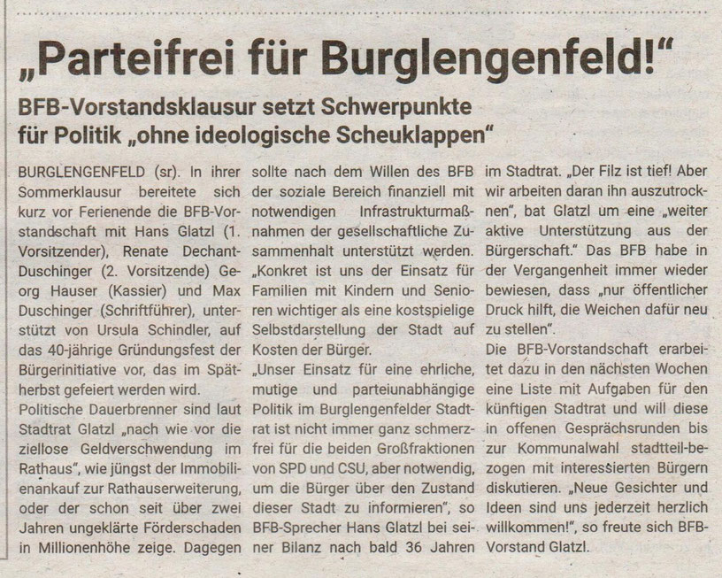 „Mut zu klaren Entscheidungen, mehr Weitsicht und weniger Gutachten, die bei Nichtgefallen nur in den Rathausschubladen verschwinden!“ fordert Sprecher Hans Glatzl von seinen Stadtratskollegen anlässlich der Corona bedingt nachgeholten Generalversammlung des Bürger-Forum Burglengenfeld (BFB)auf.